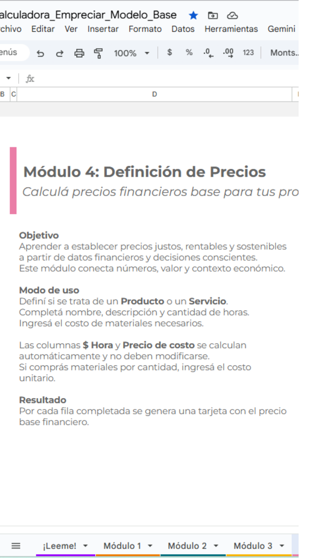 Empreciar es mucho más que una planilla, es el primer método de costeo y fijación de precio estratégico para la Economía Creativa. Traducí tu talento e intangibles en un precio de venta sólido. Ideal para creadoras, hacedoras y marcas de autor que buscan sostenibilidad financiera y crecimiento.